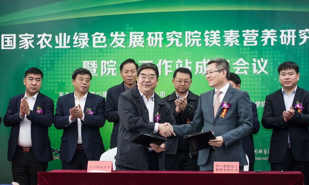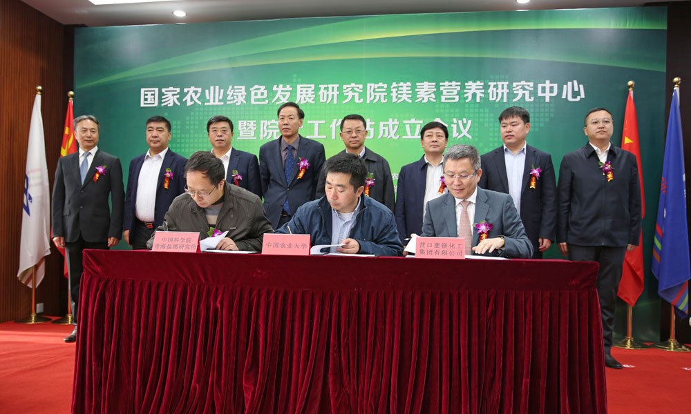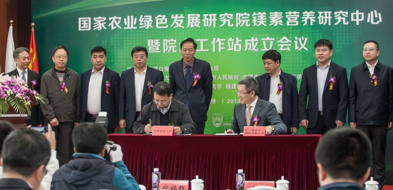 中國農業大學杜金昆、中國科學院青海鹽湖研究所吳志堅、營口菱鎂化工集團總裁車太龍共同簽訂了《國家農業綠色發展研究院鎂素營養研究中心合作協議》。中國農業大學杜金昆處長、營口菱鎂化工集團總裁車太龍簽訂《技術合作協議》。