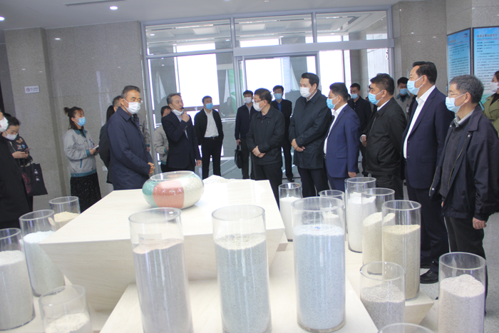 在集團產品和科技成果展廳,集團董事長張榮陽對李曉安副主席等省市領導的到來表示歡迎,并對企業鎂化工發展歷程、產品類型、產品發展方向、科技成果等方面進行匯報。