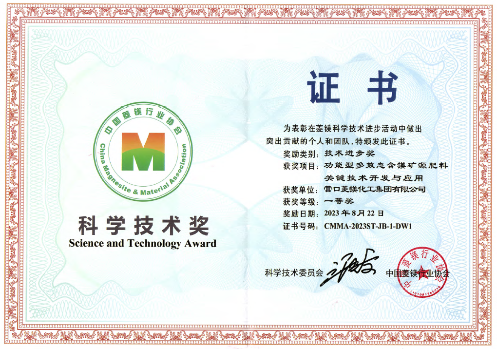 近日,第二屆全國鎂資源利用學術會議在青海省德令哈市召開,會上舉行了2023年度中國菱鎂行業協會科學技術獎頒獎典禮,營口菱鎂化工集團【功能型多效態含鎂礦源肥料關鍵技術開發與應用】項目榮獲技術進步一等獎。